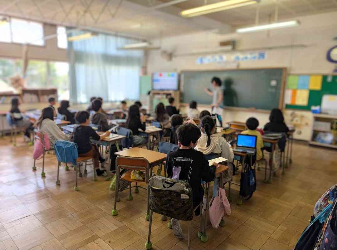 5年生は教科担任制を導入しています。外国語の学習を真剣に楽しく受けていますね! おや?教科担任の先生の様子が…笑