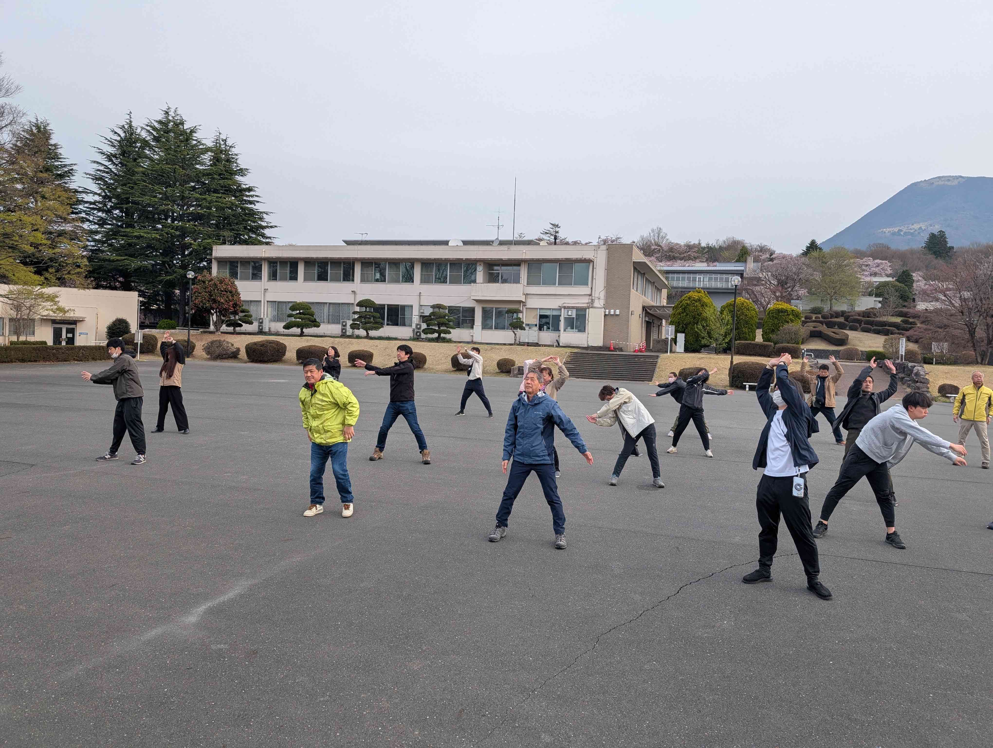 国立赤城青少年交流の家では、朝7時から「朝のつどい」を行うということで、当日の流れを確認するために先生達も行いました。 役割分担をして子供たちが行うようです。今回の私の役割はラジオ体操見本です。素敵な桜を見ながら体を動かし、清々しい朝を過ごすことができました! 桜を子供達と見れないことは残念ですが、移動教室がさらに楽しみになりました!
