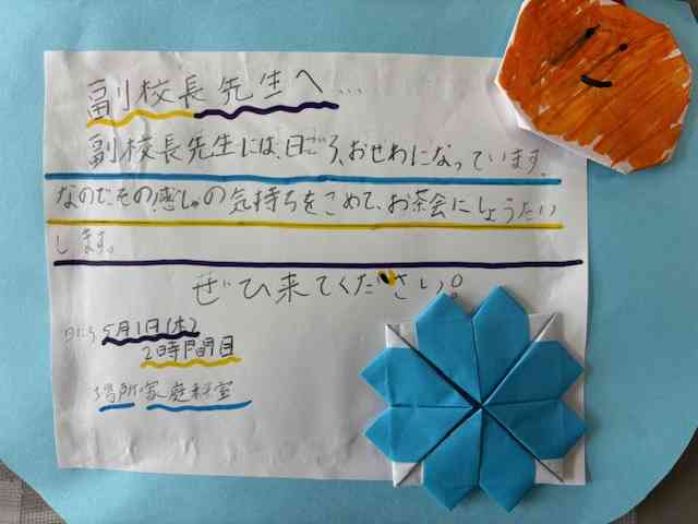 五年生から家庭科の実習で行うお茶会の、招待状をもらいました。 心のこもった招待状です。
