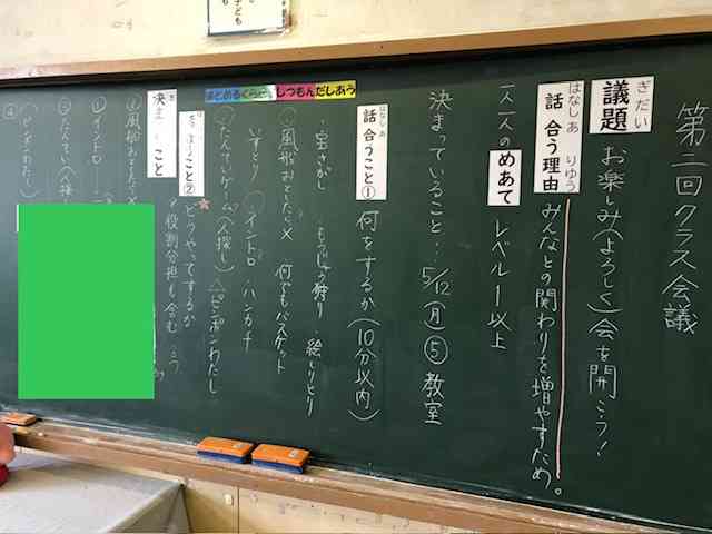 今年度、全学級で取り組んでいる クラス会議です。 子供たちが書いた議題カードから 話し合う内容を選んで進めていきます。 今回はこちらですが、 次回は学校をよりよくする 取り組みについて話し合う予定です!