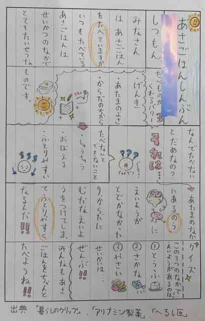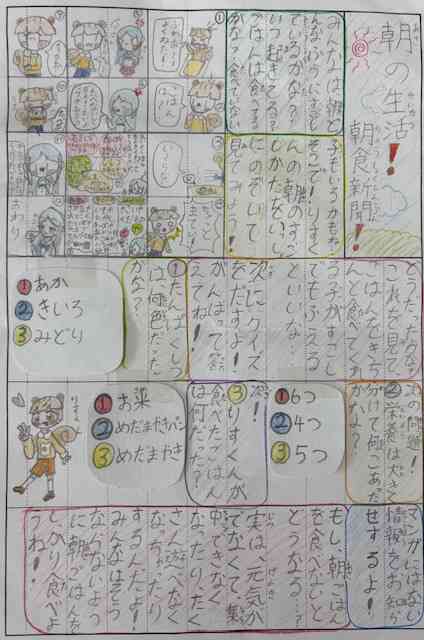 食育推進の取り組みの1つとして、6年生の家庭科の学習で食育新聞づくりをしました。 1年生から5年生までのそれぞれの学年に合わせて内容を考え、習っていない漢字はひらがなにしたり、下級生に分かりやすい言葉に変換したり、6年生が一人一人思いをこめて仕上げました。 6年生の思いが下級生に伝わり、朝ごはんをしっかり食べよう!好き嫌いをせずにいろいろな食材を食べよう!と思ってくれる子供たちが校内でたくさん増えたら嬉しいです! iPhoneから送信【添付ファイル】