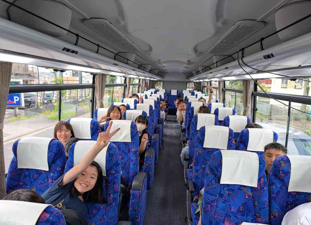 とうとう出発しました!今は、近くの友だちと話したり、遊んだりしています! ガイドさんから言われたバスのマナーもバッチリ守っています! しばらくしたら、バスレクが始まるそうです!