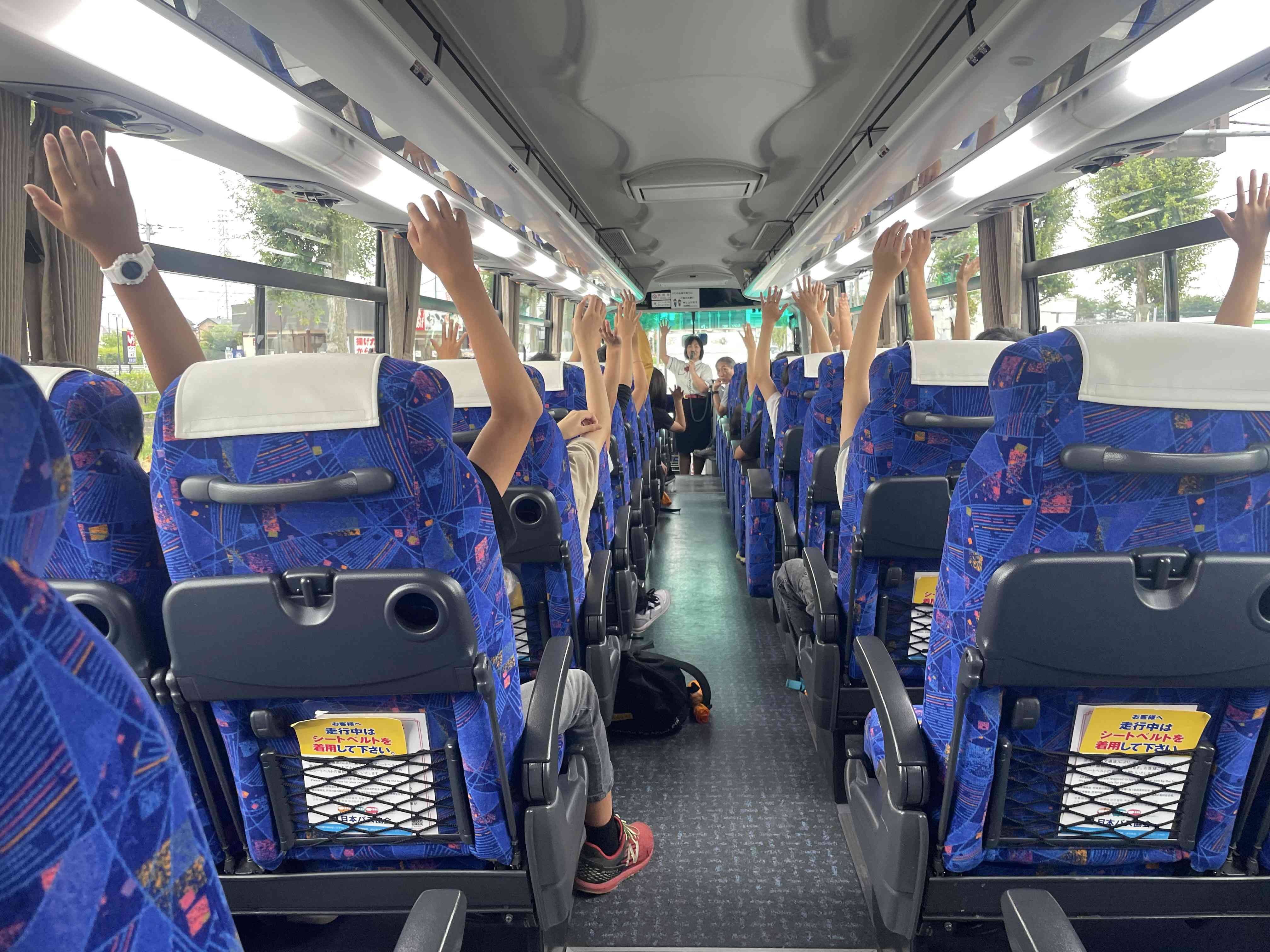 1号車ではガイドさんと移動教室で楽しみなことを確認しました。一番みんなの手が挙がったのは「キャンプファイヤー」でした!