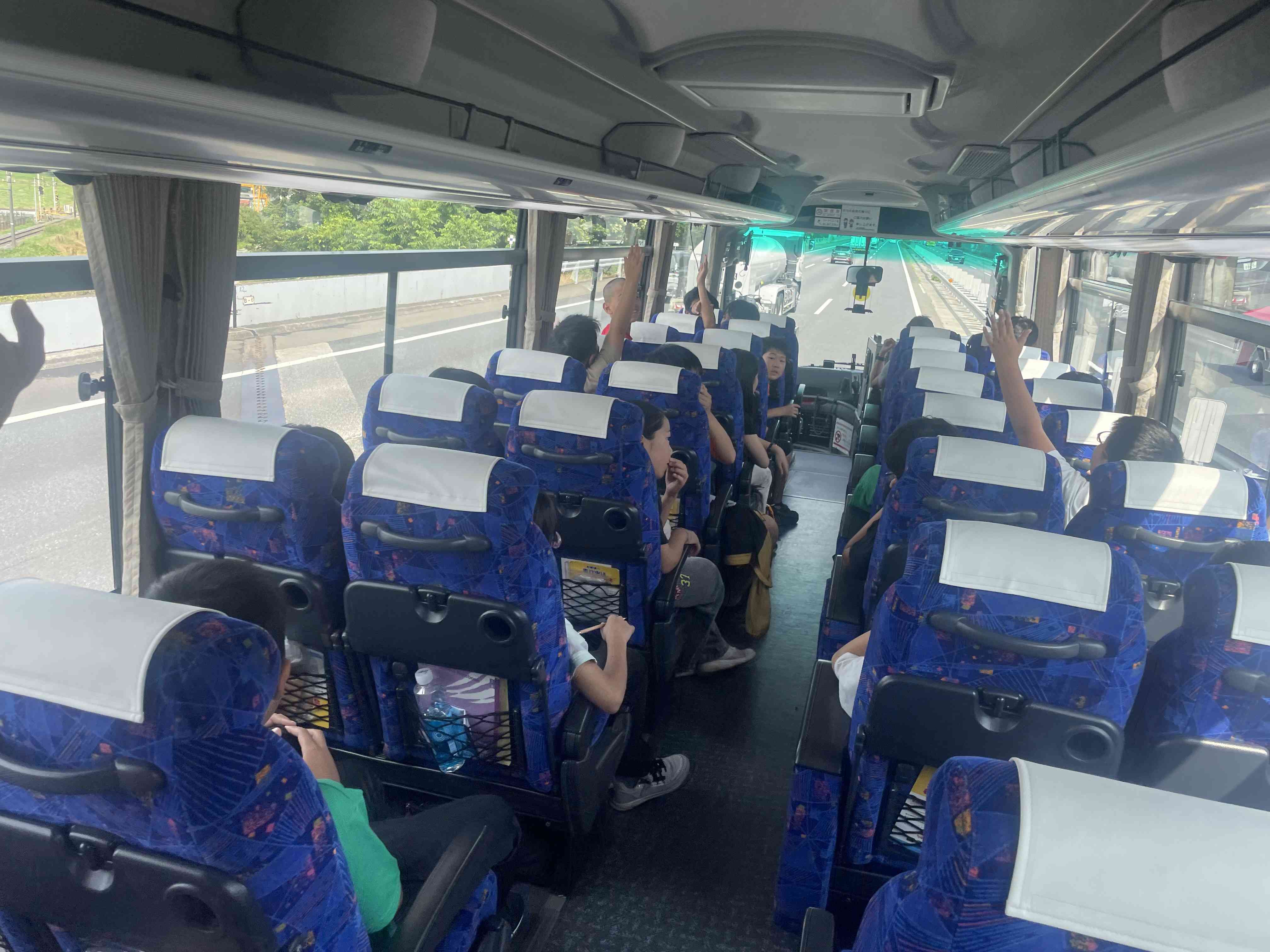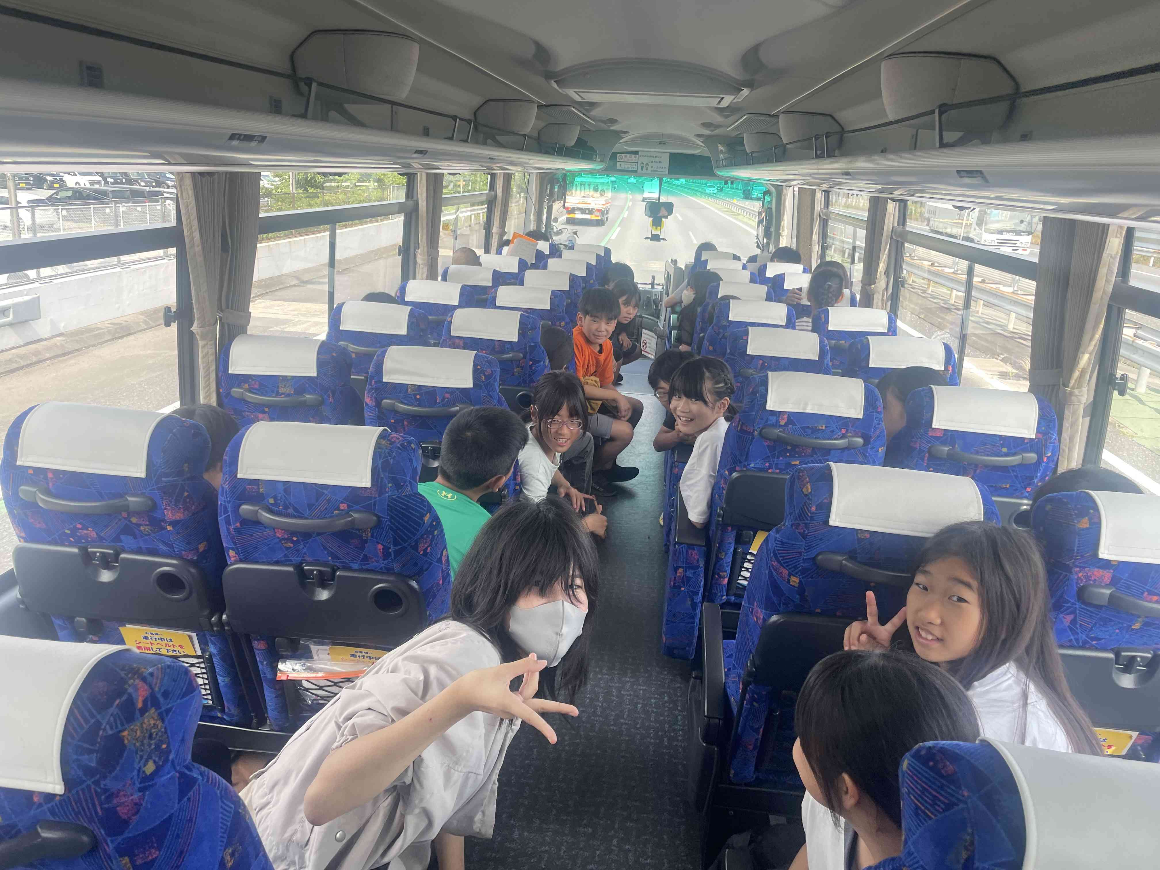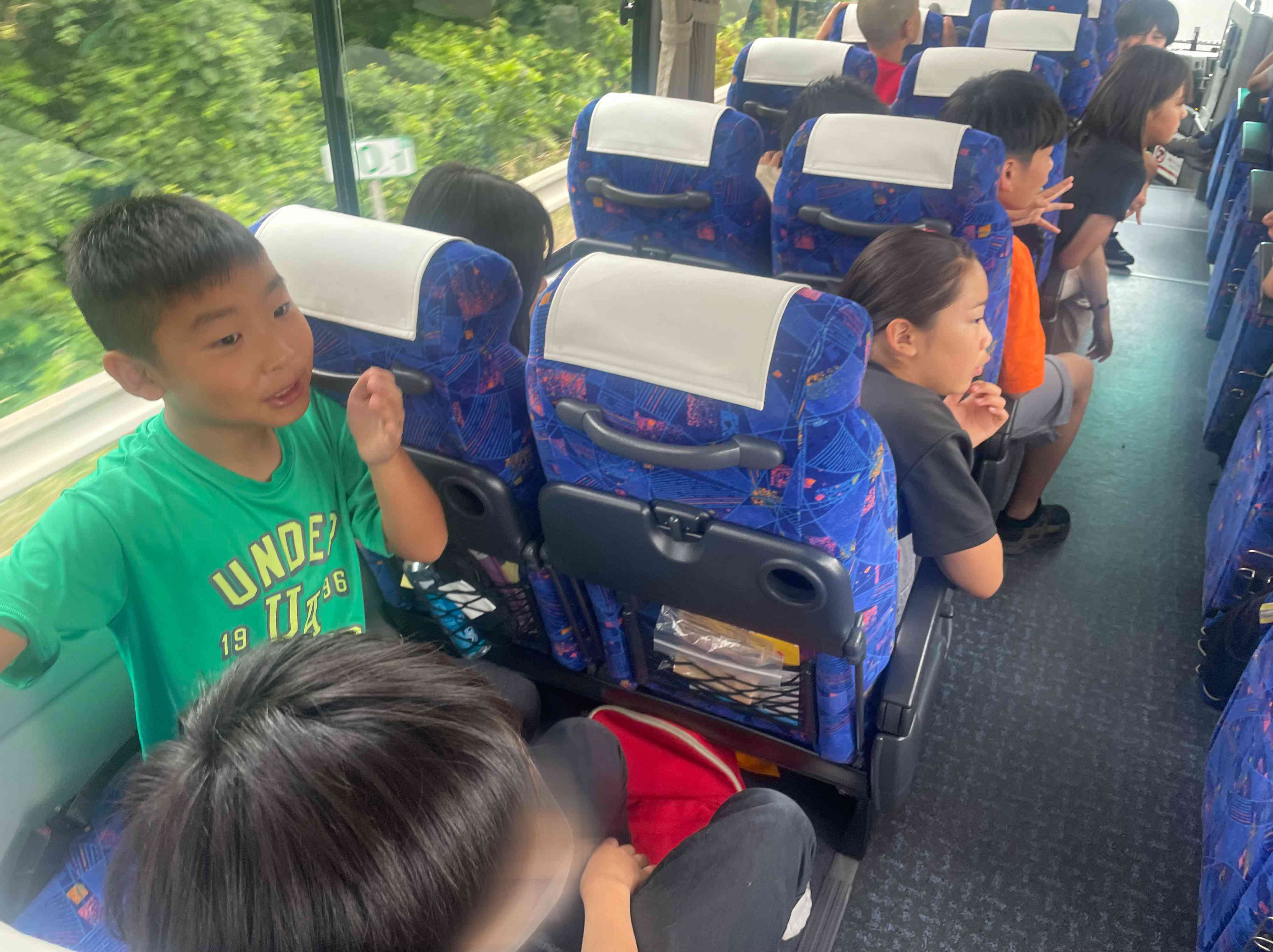 1号車のバスレクは、「暗記ゲーム」「連想ゲーム」「計算なぞなぞ」「なぞなぞ」「暗号送り」の5本立てです。企画者を中心にみんなで盛り上がっています!