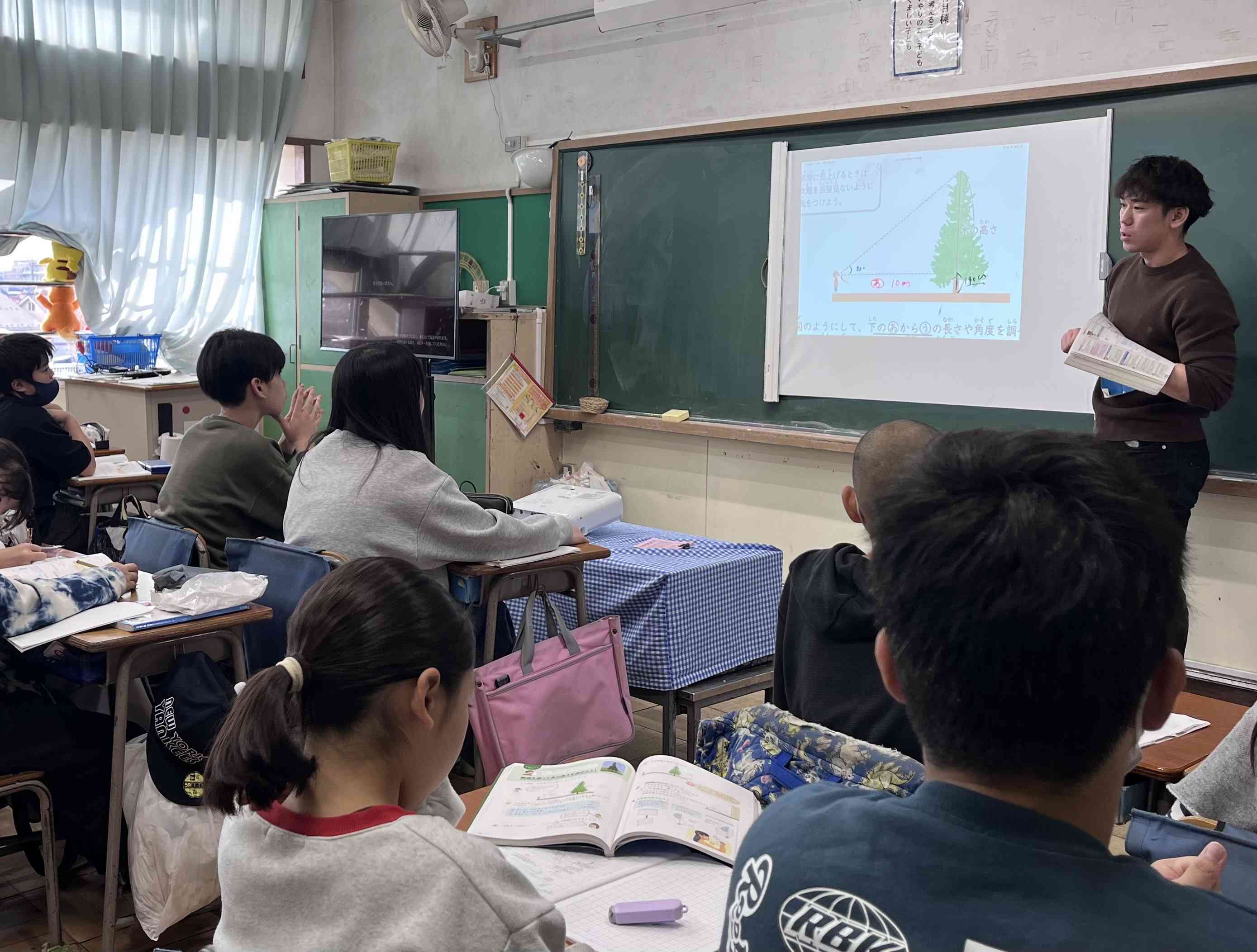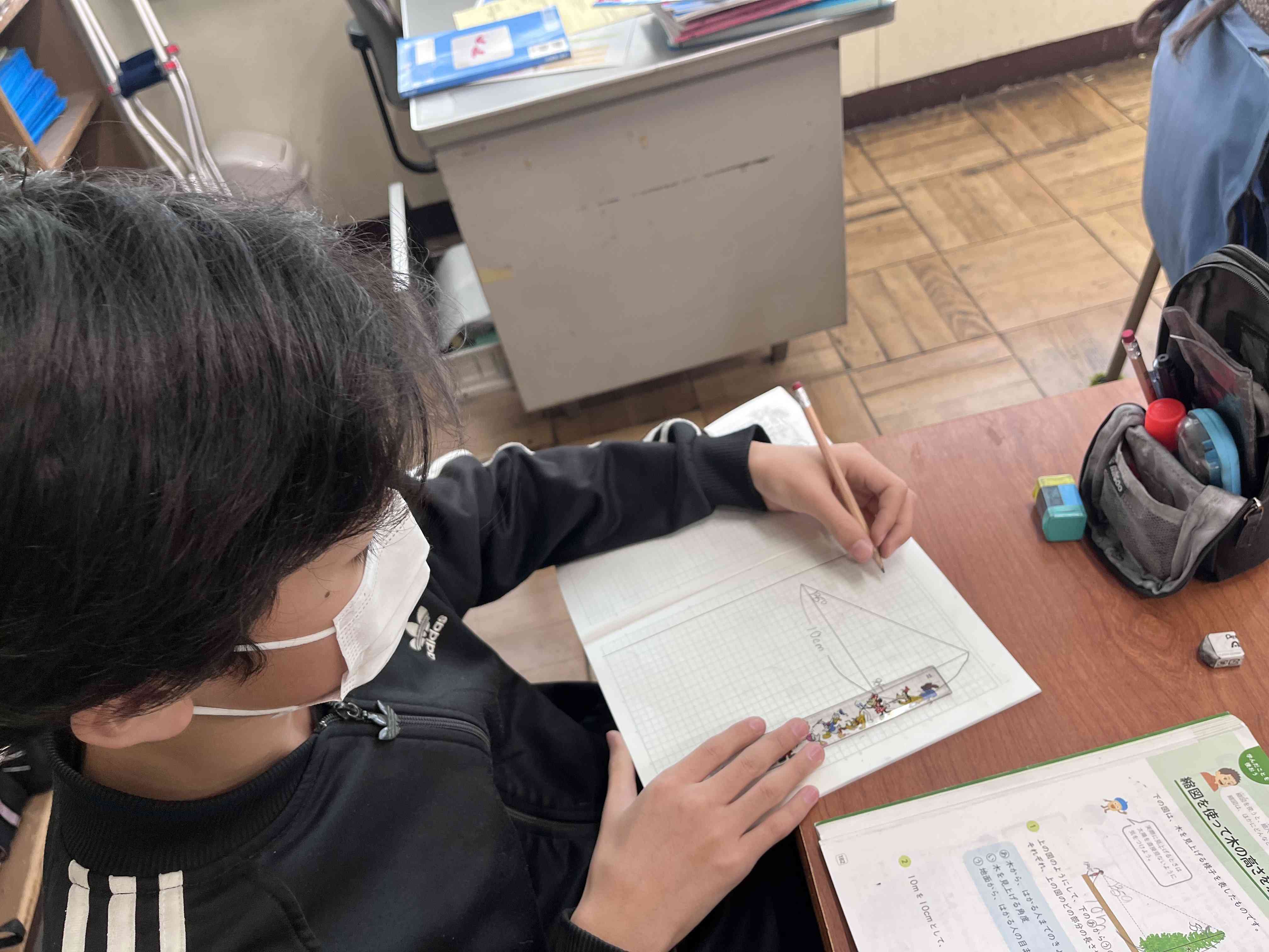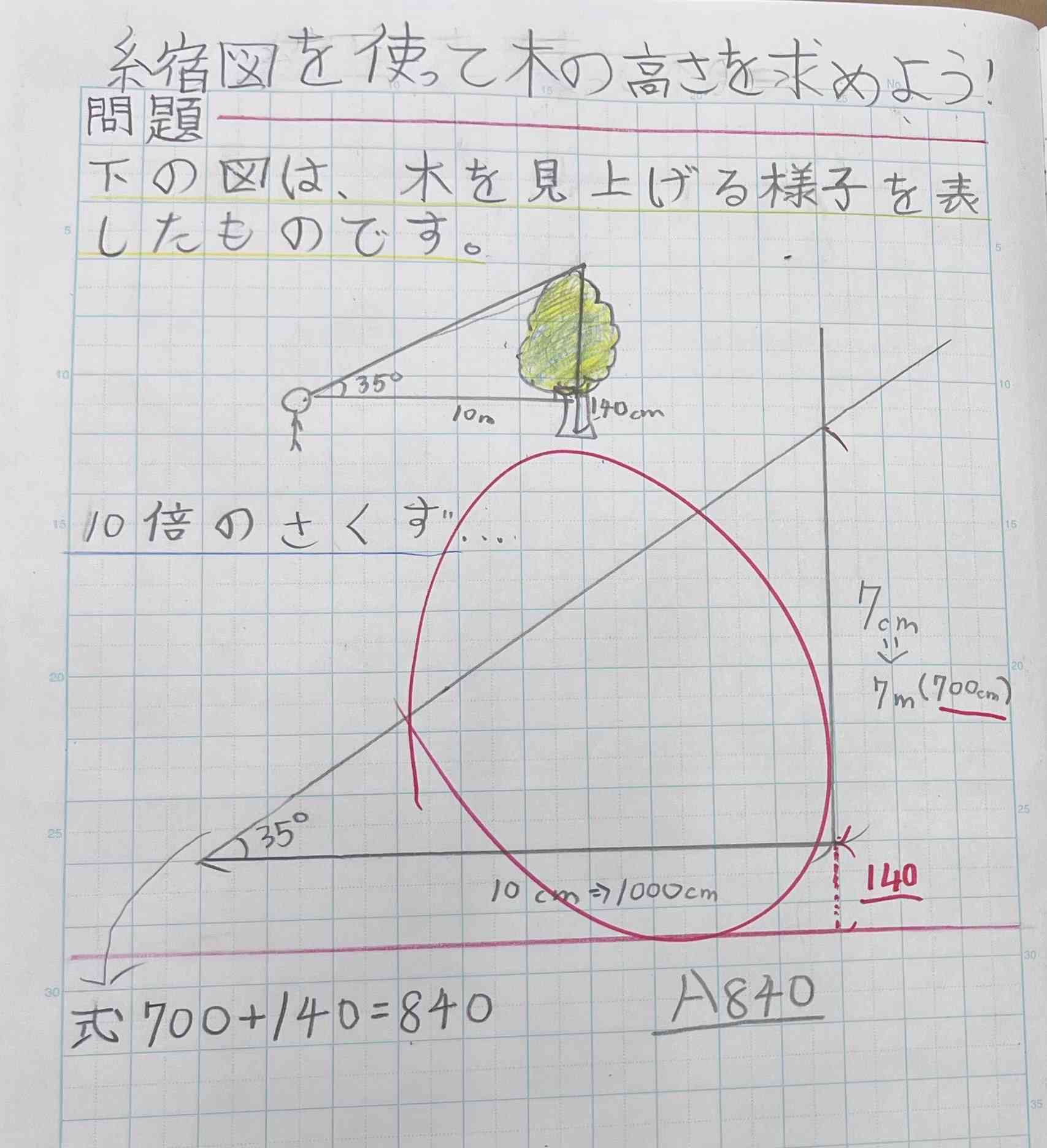 算数の学習では、縮図を活用して、木の高さを計算で求める問題にチャレンジしました。既習の縮図のかき方を思い出し作図して、 ノート上での高さを求めてから実際の長さに換算して求めました。この単元で、縮尺について学び、大きなものを縮図にして表すよさが実感できるといいです。
