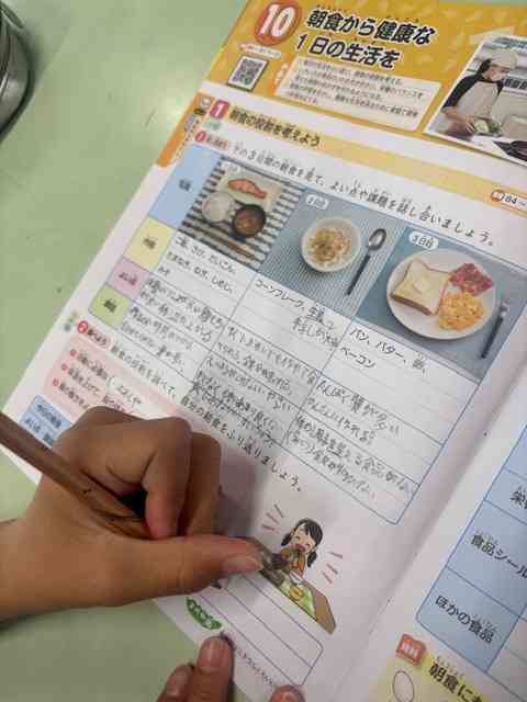 家庭科では、「朝食から健康な1日の生活を」という単元を学習しています。 今日の授業では、3日分の朝食メニュー例を見ながら、それぞれのよい点や改善できそうな点について意見を出し合いました。また、映像や資料を通して、朝食が体や心にどのような役割をもっているのかについても理解を深めることができました。 子供たちには、「朝ごはんは体の目覚まし時計」であることを伝えています。朝食をとることで、体がしっかりと目覚め、元気に1日をスタートさせることができます。 もし朝食を食べる習慣がまだ身についていない場合は、まずは「何か一口でも食べること」から始めてみることが大切です。そして、すでに毎日朝食をとっているお子さんは、栄養バランスにも目を向けながら、よりよい食習慣へとステップアップしていけるとよいですね。 ご家庭でも、無理のない範囲で朝食について話題にしていただけると嬉しいです。【添付ファイル】